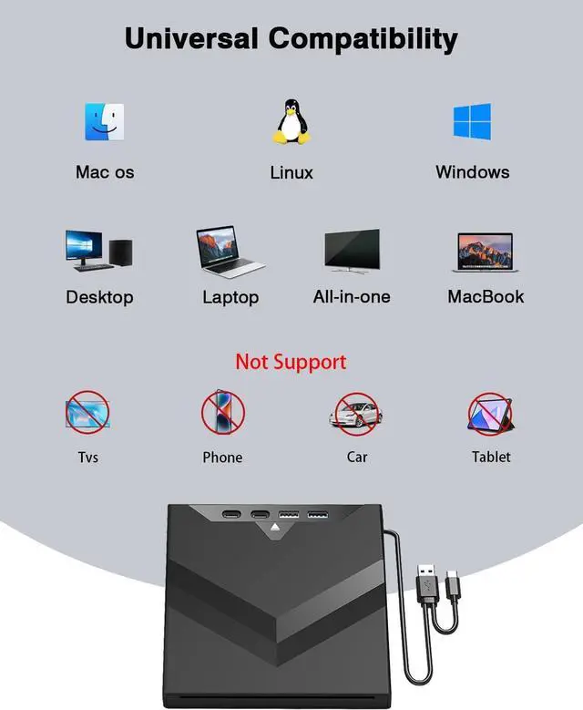 [Wide Compatibility]:Boasting exceptional versatility, this external CD/DVD drive offers broad compatibility with operating systems from Windows 98 to Windows 11 and Mac OS 8.6 to 10.14, making it an excellent choice for MacBooks, desktops, laptops, and all-in-one computers. It fully supports reading and writing a comprehensive array of disc formats such as CD+/-R, CD+/-RW, DVD+/-R, DVD+/-RW, DVD-RAM, VCD, and SVCD.