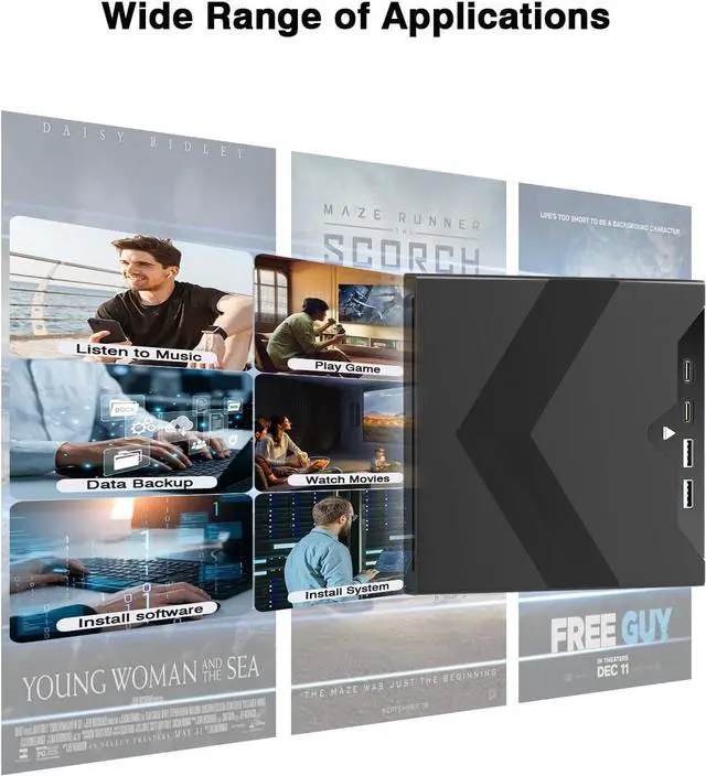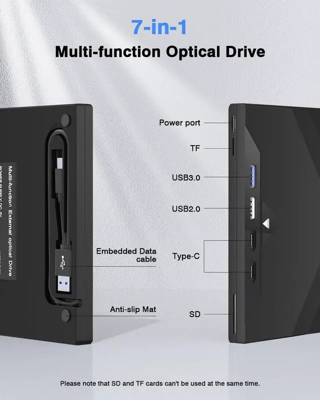 This 7-in-1 External Drive is the ultimate all-in-one solution for your digital life, featuring a comprehensive set of 7 ports—including SD and TF card slots (note: not usable simultaneously), dual Type-C, USB 3.0, USB 2.0, and a power port—to effortlessly handle all your needs from installing software and backing up data to enjoying music, movies, games, and reading or burning CDs, DVDs.