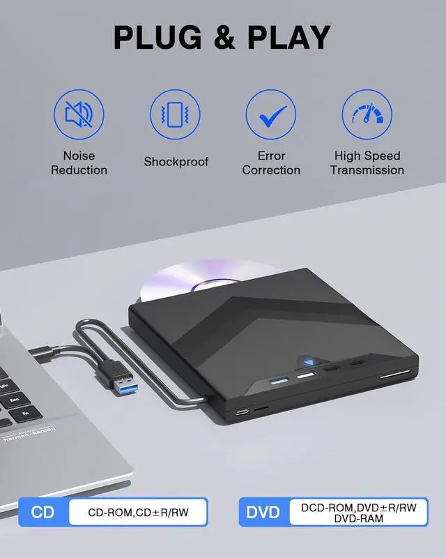 [Plug&Play]: This external CD DVD drive comes with USB port, no additional drivers and power supply. Just plug the USB connector into your computer and the CD drive will be detected by computer automatically.