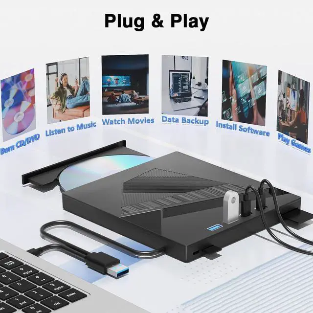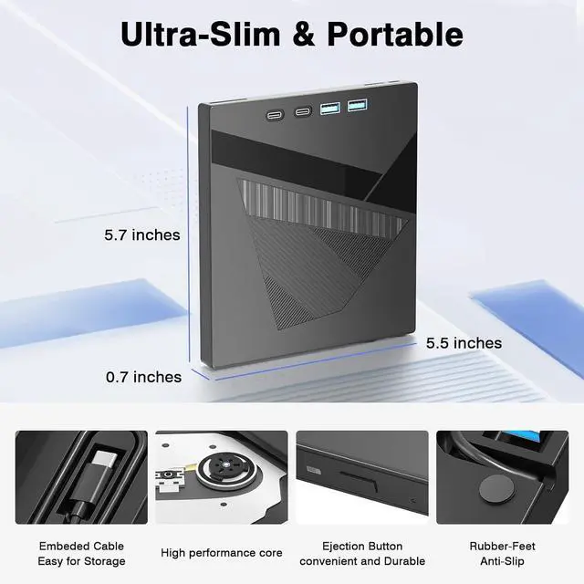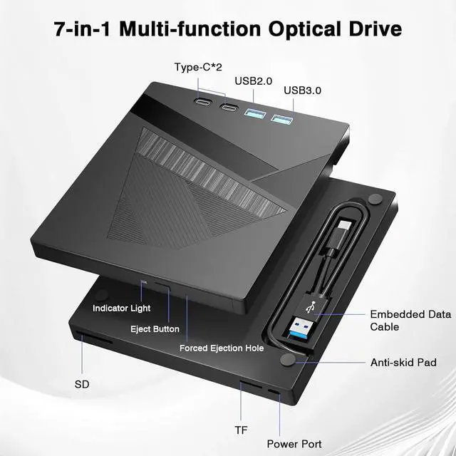 Compact & Portable Design: Crafted with a slim, lightweight profile and a built-in, tangle-free cable for easy portability. The integrated non-slip rubber pad keeps the drive firmly in place during operation, preventing scratches and reducing vibration. Take your media and connectivity with you anywhereideal for work, travel, or home entertainment.