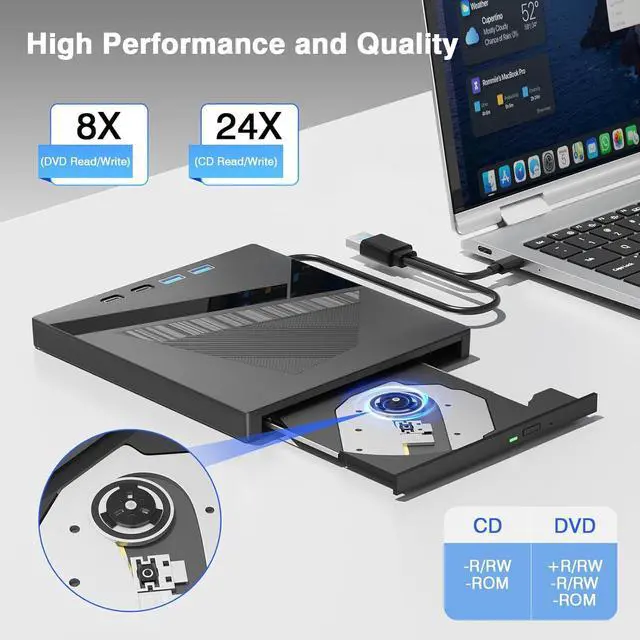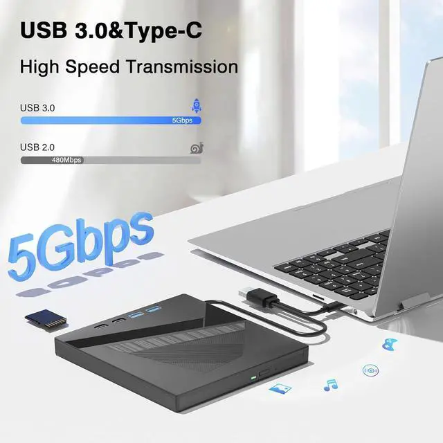 High-Speed USB 3.0 & Type-C Connectivity: Experience rapid data transfer, approximately 10x faster than traditional USB 2.0, with speeds up to 5 Gbps (625 MB/s). The dual USB 3.0 and modern Type-C interface ensure broad compatibility and future-proofing. Burn CDs at speeds up to 24x for efficient archiving.