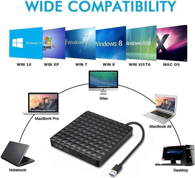 ADVANCED USB3.0 TECHNOLOGY: Our CD/DVD Drive is equipped with USB 3.0 high speed interface, bringing you faster data transmission speed and stable performance with strong fault tolerance. USB3.0 transmission standard,backward compatible with USB2.0, data transmission speed stability, up to a maximum of 5Gbps.