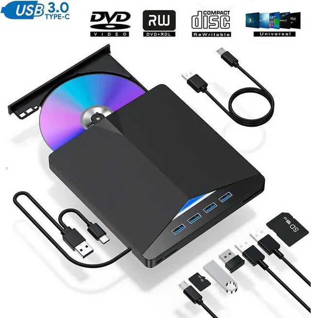 Optical Drive: Our portable DVD player is not only a CD/DVD reader, but also a CD/DVD burner/burner, 4 port USB 3.0 hub, SD card reader, TF card reader (SD card and TF card are not used at the same time)