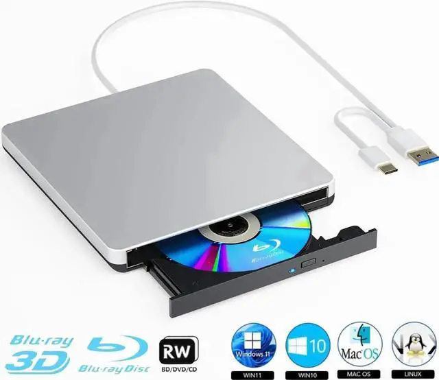 External Blu-ray Drive, BD Player with Read/Write Capability Portable Blu-ray CD/DVD Drive Burner with USB 3.0 and Type-C DVD Burner 3D Blu-ray Drives Compatible with Windows and Mac OS PC Laptops