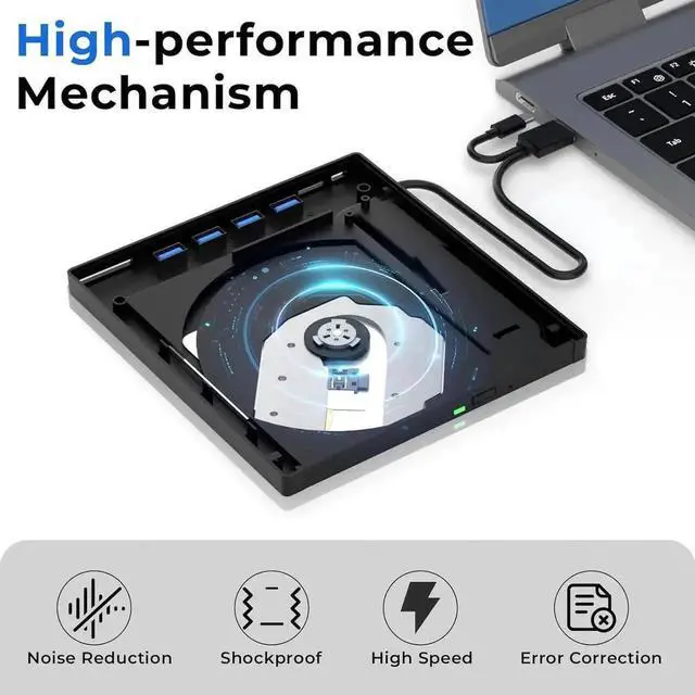 Ultra-Fast 5Gbps Transfer SpeedThis external CD/DVD drive is equipped with USB 3.0 and Type-C transmission interfaces, offering10x faster speeds than traditional USB 2.0. reaching up to 5Gbps for quick file transfers. Besides, it features an independent power cord to avoid recognition errors and operation interruptions due to insufficient power. This external DVD drive has features silent operation, resistance, quietly , shock-resistant and low power consumption ensures efficient and smooth data reading/writing.