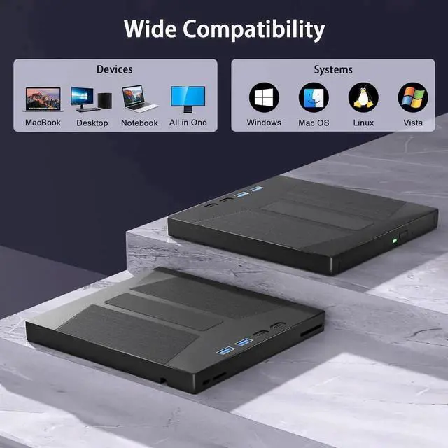 Our external blu ray/dvd drive for PC is compatible with computers, MacBook, Laptop, Desktop, All-in-one and PC, works seamlessly with Windows OS (11/10/8/7/XP) as well as MacOS, Linux, so you can enjoy 3D playback to the fullest. Please note that the blu ray burner does not support Chrome, smartphones, tablets, TVs and cars.