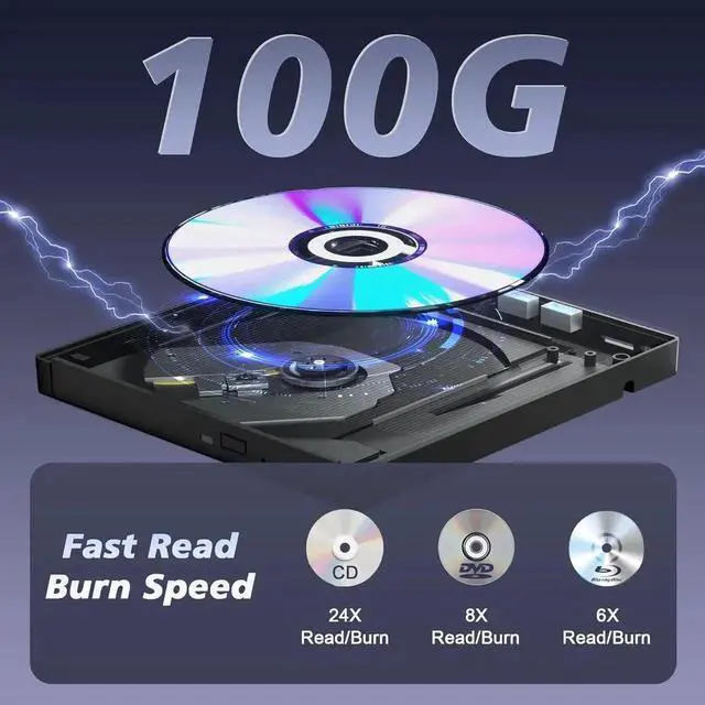 Our external blu ray player is designed with a 2-in-1 transfer cable notch on the back, plug and play to avoid losing it. Equipped with advanced USB 3.0 interface, enjoy up to 5Gbps super speed, up to 6x for blu ray reading, up to 8x for DVD, up to 24x for CD. The package also comes with a power cord that can be used as an extra power supply if you run out of power.