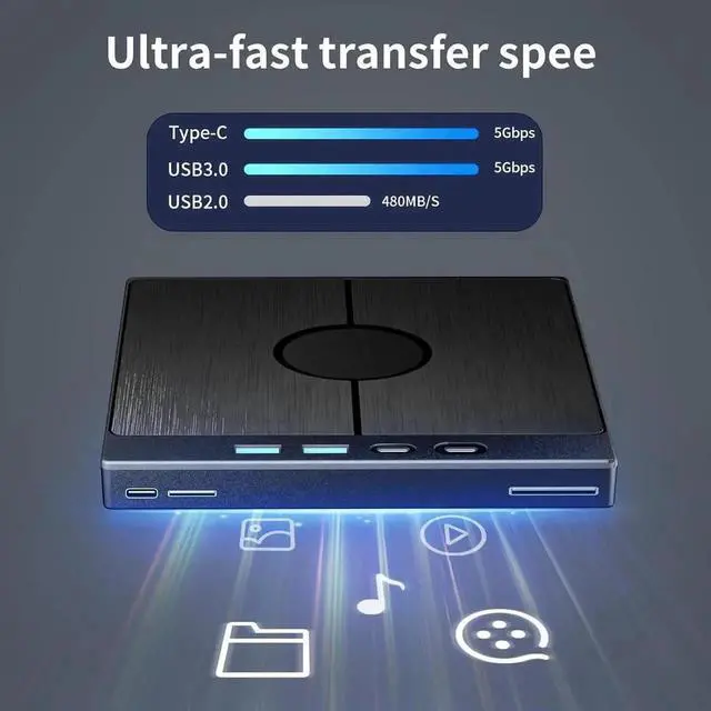 Compared to a usb blu ray drive external, this product Support 100G BD disc reading & writing, this blu ray dvd player features an advanced high-speed 3.0 interface that reaches a maximum speed of 5Gbps, which is 6 times faster than traditional 2.0 (480Mbps). Additionally, the Type-C interface has strong error correction capabilities, impact resistance, and low power consumption, ensuring stable and reliable data transfer. And our drive can read BD discs at speeds of up to 6x, DVDs at up to 8x, and CDs up to 24x