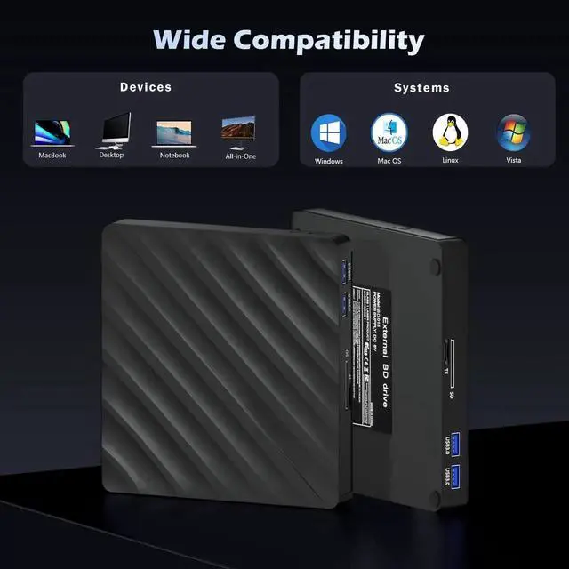 Wide Compatibility --- The USB 3.0 & Type-C Bluray drive supports a wide range of operating systems, such as Windows XP/2003/Vista/7/8/10, Linux, and all versions of the Mac OS system. It is an ideal choice for laptops, desktops, and MacBooks lacking an integrated optical drive. Kindly be aware, though, that it is not compatible with BD recorders, tablet iPads, Surface tablets, TVs, projectors, smartphones, or cars.