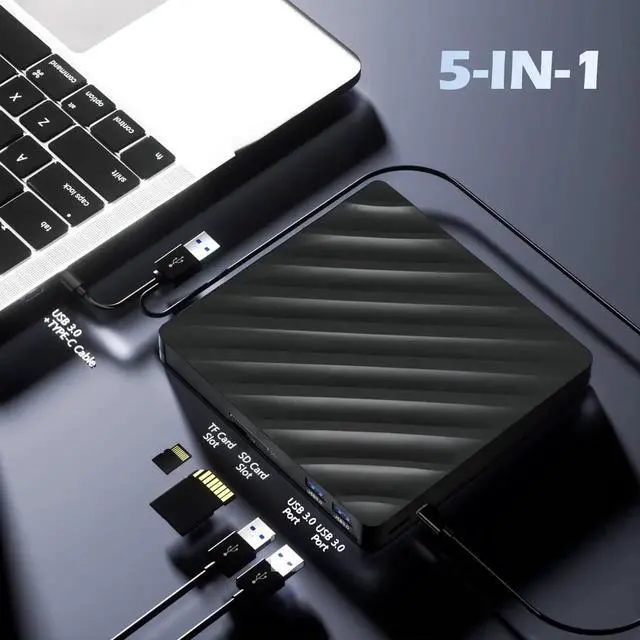 MultifunctionThis 5-in-1 external Bluray drive offers versatile features. It has 1 SD card slot, 1 TF card slot, and 2 USB 3.0 ports for data transfer or charging purposes. It supports reading BD/DVD/CD discs and writing DVD/CD discs. However, it does not support burning BD discs. You can easily copy music, movies, and data files from SD cards, TF cards, or through the USB ports to your computer. You can also transfer files from a Bluray player to an SD card, USB hard drive, or USB flash drive. Please note that the SD card and TF card cannot be used simultaneously; you can only choose one at a time. However, both of them can function simultaneously with the 2 USB 3.0 ports.