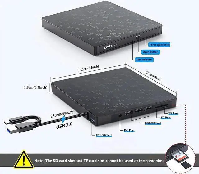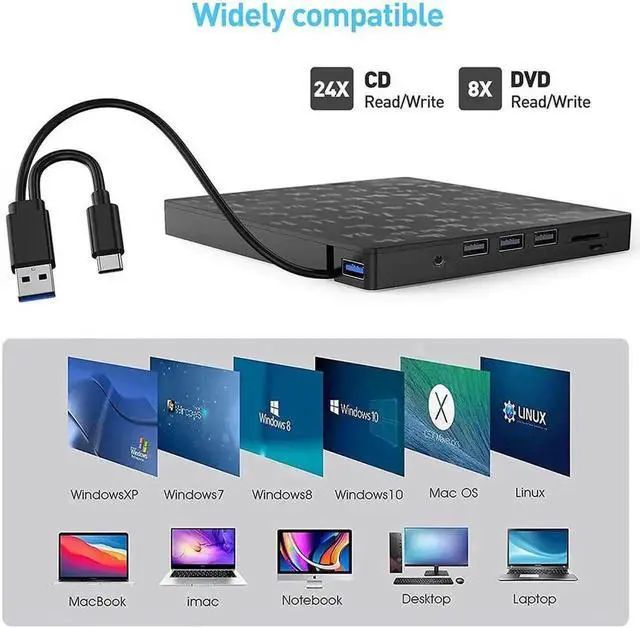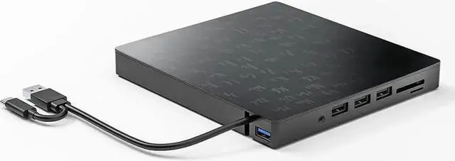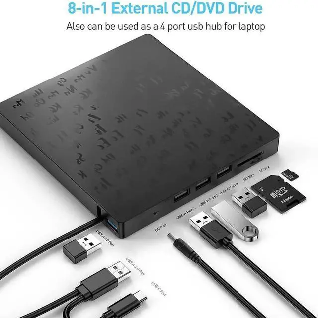 It's not only a premium CD/DVD optical drive burner but also equipped with additional four USB ports, one SD & one micro-SD card slot to connect your USB flash drive, 2.4G wireless/ Blutooth receiver, SD/micro-SD card, and other PC accessories, alleviating the trouble of insufficient interfaces on your computer