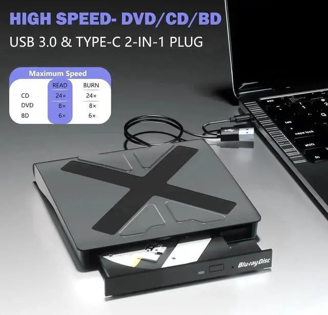 • High Performance: with high-speed USB 3.0 and Type-C interface exhibit exceptional error correction capabilities, impact resistance, minimal sound, and low power consumption. It can read CDs at speeds of up to 24x, DVDs at up to 8x, and BDs at up to 6x. Additionally, it supports burning normal CDs and DVDs in sizes of 8.5GB, 4.7GB, and 700MB, as well as 3D discs.