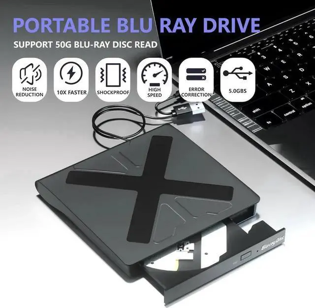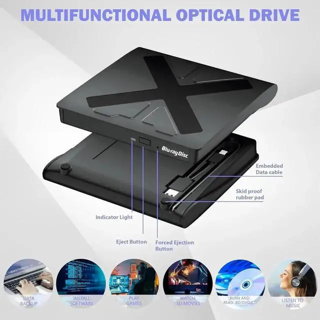 • Portable Blu-Ray Player: The drive features two concealed wire grooves that are specifically designed to store and carry both USB 3.0 and Type-C interfaces. This feature helps users to easily store and traffic the Blu-ray drive without taking up too much space or risking losing one or both cables.