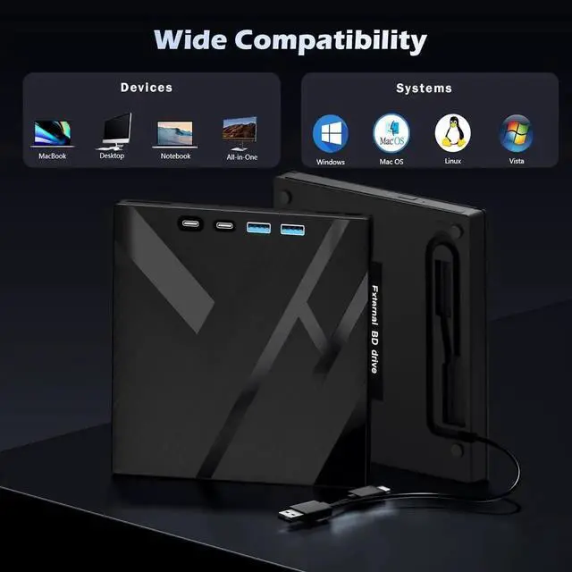 External Bluray Drive: This offers versatile features. It has 1*SD card slot, 1*TF card slot, 2*Type-C ports, 1*USB 3.0 +1*USB 2.0 ports, and 1*2-in-1 cable(usb 3.0 +type-c) for data transfer or charging purposes. It supports reading BD/DVD/CD discs and writing BD/DVD/CD discs. You can easily copy music, movies, and data files from SD cards, TF cards, or through the USB/Type-C ports to your computer. You can also