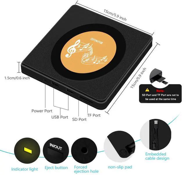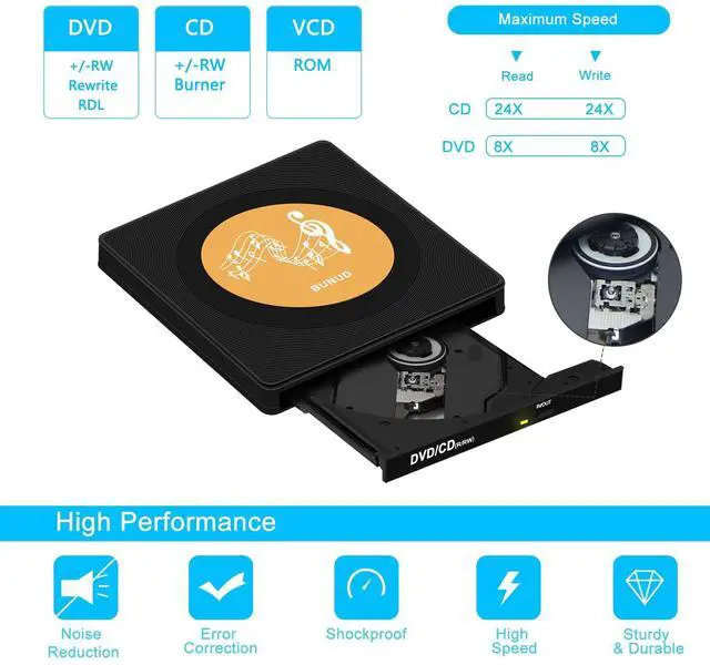 This ultra slim CD/DVD drive for laptop with embedded cable design, And the embedded data cable is easy to use and organize, skip-proof rubber pad prevents sliding on the desktop.