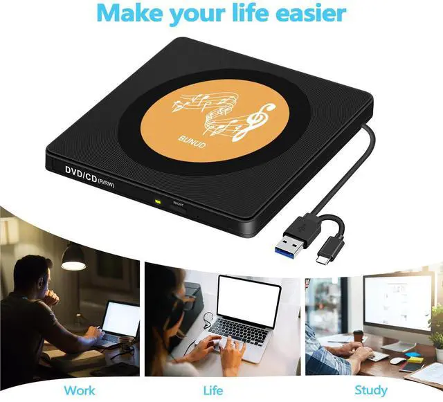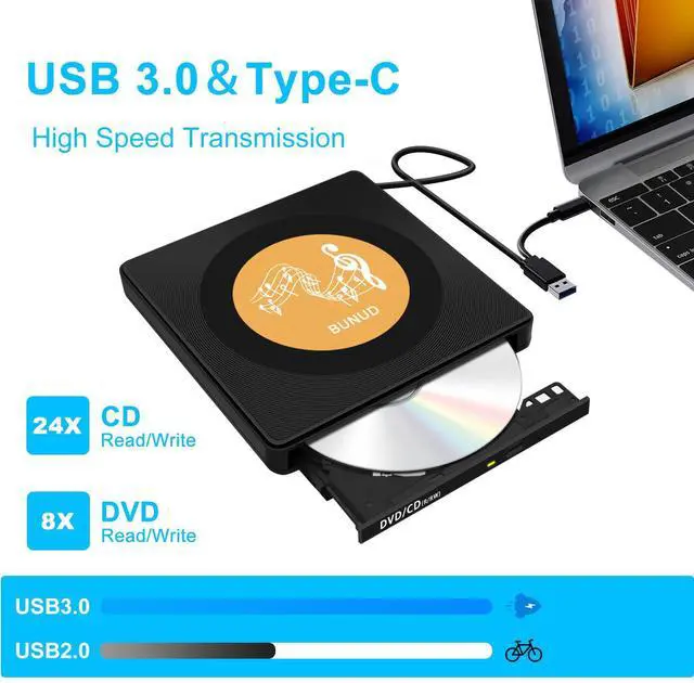 The CD DVD drive with USB 3.0 Type-C two kinds of connectors, just plug it into the USB port, insert your CDs or DVDs, this external CD/DVD player will be recognized by your laptop or desktop computer automatically. No extra driver program is required!