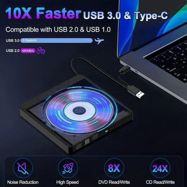 Our external CD DVD drive for laptop, you can insert it into your laptop or desktop computer to automatically recognize it, powered directly by USB without the need for additional drives or applications. You can enjoy up to 8X DVD reading speed and up to 24X CD reading speed.
