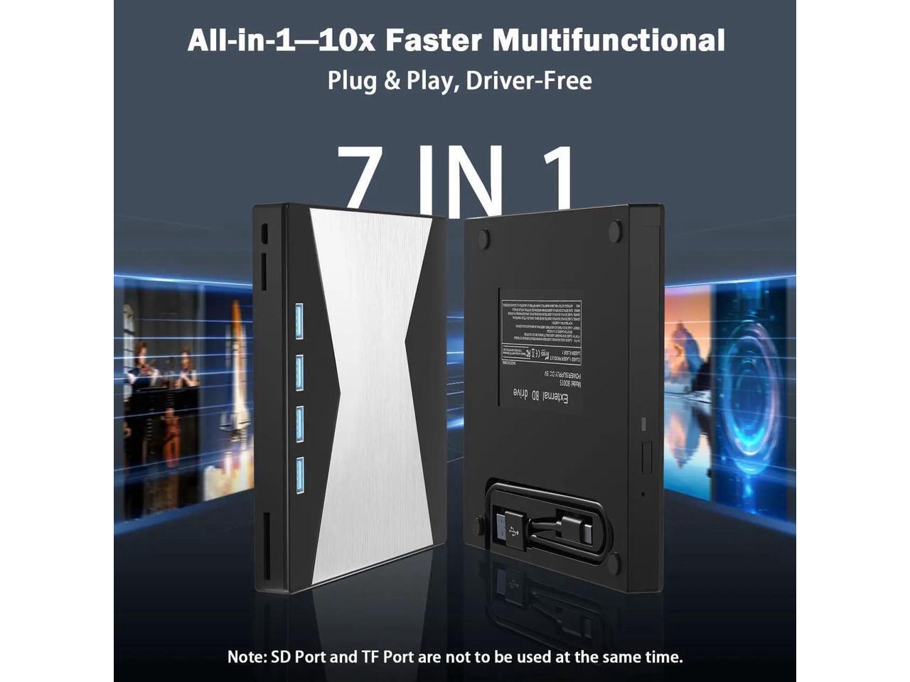 - 7 IN 1 Blu Ray Drive: Our blu ray drive external can not only burn and read CD/DVD/BD but also can be used as an external laptop USB hub, including 1 USB 3.0 port, 3 USB 2.0 ports, 1 TF slot, 1 SD card slot, compatible with USB hard drive, limited/wireless mouse & keyboard, computer cooler and other USB computer accessories, The card slot for transferring photo and video files from your camera from cards to computer.