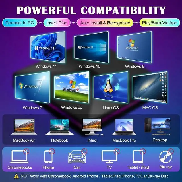 Transform your computing experience with this versatile CD DVD drive that combines modern connectivity with classic optical disc support. This external drive features USB-C compatibility and additional USB ports alongside SD/TF card slots and audio output, making it a comprehensive media solution. Perfect for laptops, PCs, and MacBooks, this drive handles both reading and writing of CDs and DVDs with ease. The sleek design is enhanced with ambient lighting, adding a touch of style to your workspace. Compatible with Windows 11/10 and Mac systems, this optical drive is ideal for those who need to access older media, create backups, or burn new discs.