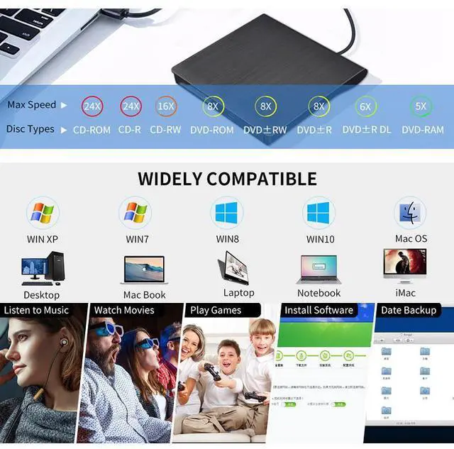 Supported Disc: CD-ROM, DVD-ROM, CD-R, CD+/-RW, DVD-R, DVD+/-RW, DVD-R DL