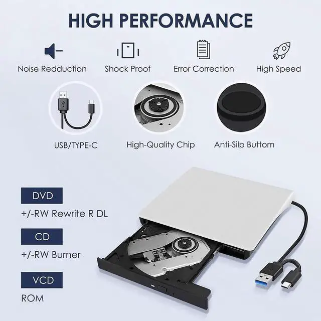 Play Convenience: Our external CD/DVD drive requires no additional drivers or applications! Simply connect it to your laptop via USB 3.0 or Type-C and its ready to go. Perfect for playing music, watching movies, installing software, or burning media. Its compact, travel-friendly design makes it a great addition to your laptop