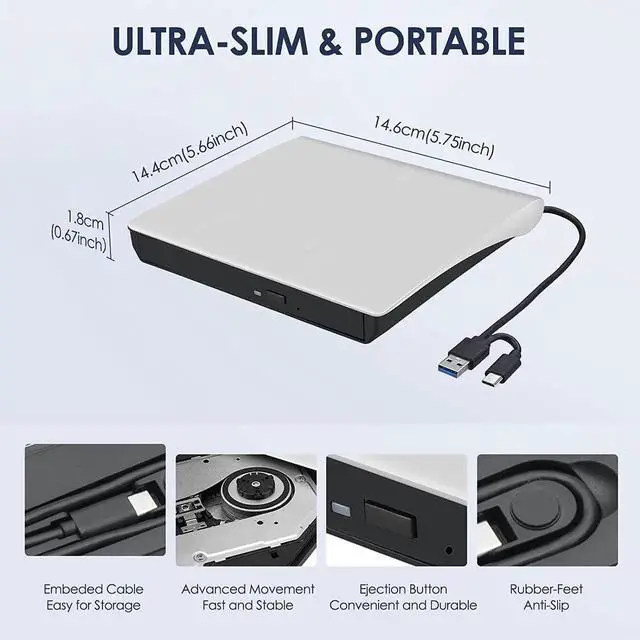 Equipped with USB-C and USB-A connectors make it easier to connect to more laptops and desktop computers, no USB hub/adapter required. Plug into your computer, insert your disc, it will be recognized by your computer automatically, then you can use the compatible software to read or burn your CDs/DVDs.