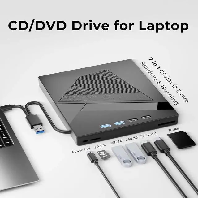 With a 2-in-1 cable embedded in the back of the optical drive, whether your device interface belongs to USB or Type-C, you can use this cd and dvd burner to install software, backup data, watch movies, play games, listen to music, burn/read CD/DVD at all. Moreover, the transfer speed of the usb dvd drive external support up to 5G bps, support up to 8x for DVD, and up to 24x for CD.