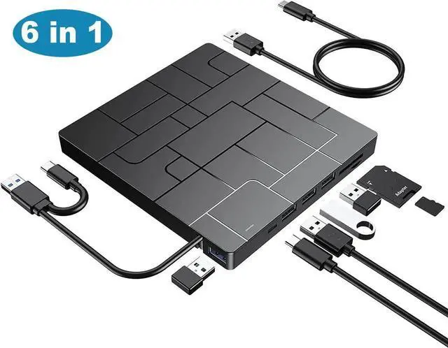 [6 in 1] External CD DVD Drive, Type C&USB 3.0 External CD DVD Burner for Laptop with 4 USB Ports&2 SD Card Slots&1 Type-C Ports, CD/DVD ROM +/-RW Optical Disk Drive for Windows 11/10/8/7 Linux Mac OS