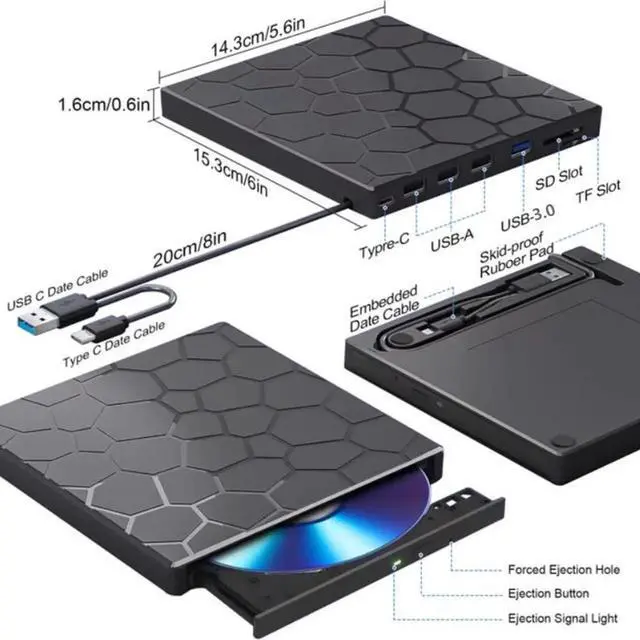 [8 IN 1 Optical Drive] Our portable DVD player is not only a CD/DVD reader, but also a CD/DVD burner, including 1 port USB 3.0 hub, 3 USB 2.0 port, SD or TF card reader,It is perfect for transferring photo and video files from your camera by cards to your computer. (Note: SD and TF card cannot be used at the same time).