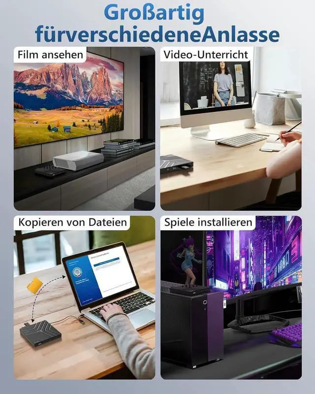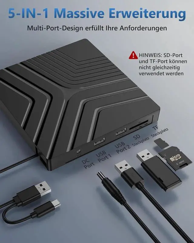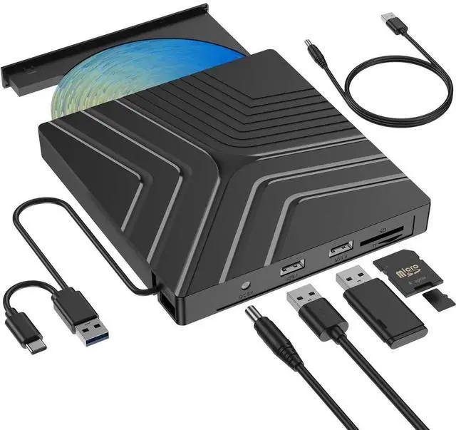 High Speed: CD-ROM drive with advanced burning technology, Z. B. Supported CD-R, CD-RW, DVD-R, DVD-RW. Max DVD-ROM read speed 8X; Max CD-ROM read speed 24X and maximum DVD burning speed 8X; Max CD burning speed 24X. External CD drive has two USB ports, 1 DC port, 1 SD slot and 1 TF slot. PS: SD port and TF slot must not be used at the same time.