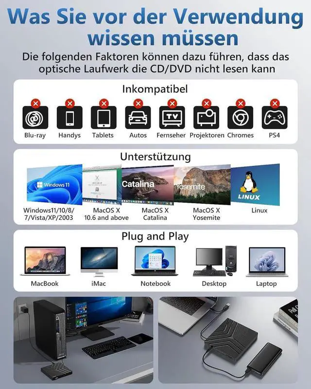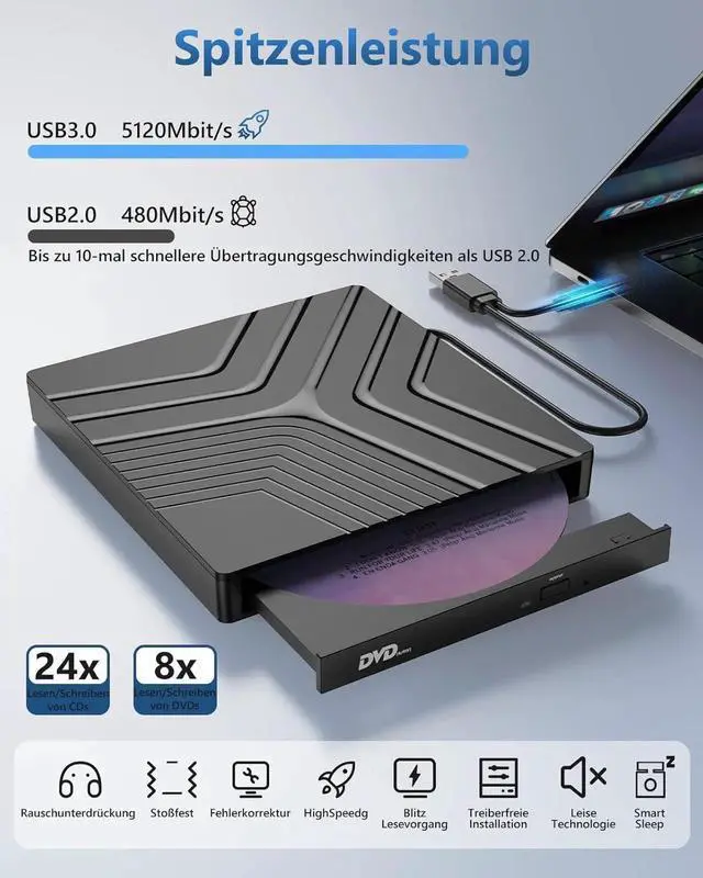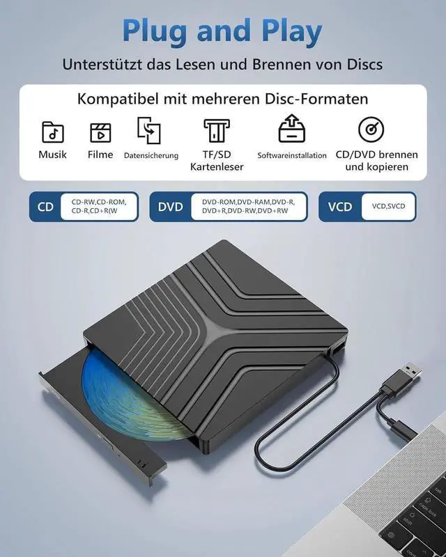 Slim and portable: our external DVD drive is perfect for your laptop. The external DVD drive has an eject button that allows you to easily insert and remove discs. This external CD ROM drive is portable and lightweight, the integrated data cable is easy to use, so you can use it without any problems. Insert it into the laptop bag of your computer and carry it at home, in the office or anywhere