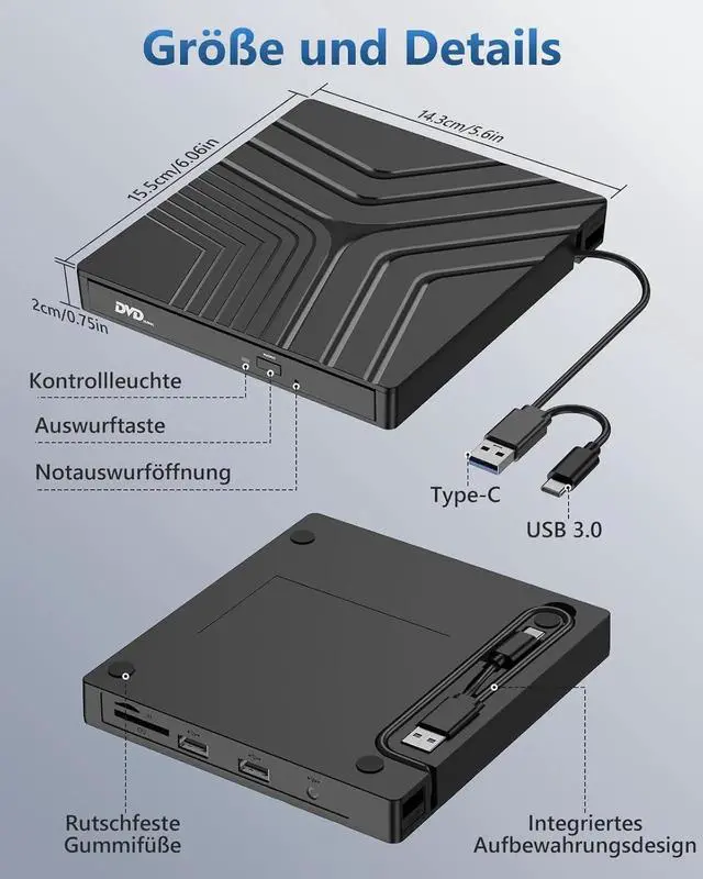 2-in-1 external DVD drive: the external DVD drive has upgraded USB and Type-C port, compatible with USB 3.0 and backwards compatible with USB 2.0, provides up to 5 Gbps data transfer and reading speed, 10 times faster than USB 2.0. The data cable can be stored on the back of the drive without worrying about losing the data cable