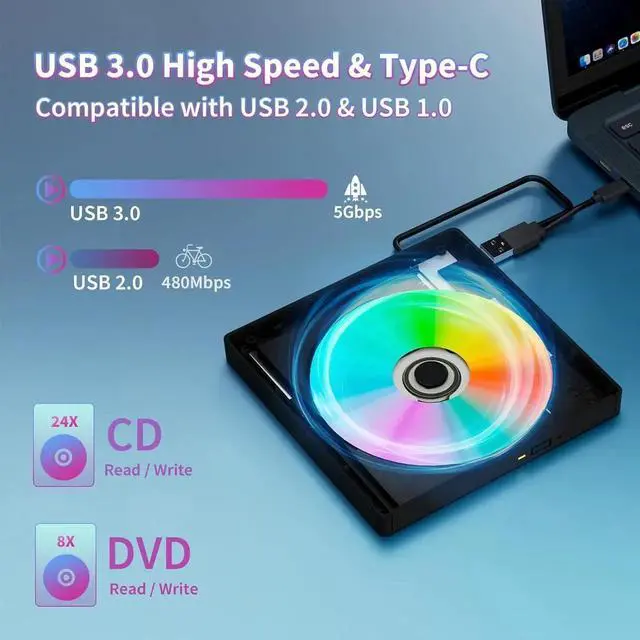 **High-speed USB 3.0 interface, no need extra power cable. Faster transmission speed bring you better experience than old DVD drive, no matter watching movies, listening to music, burning discs, installing software.