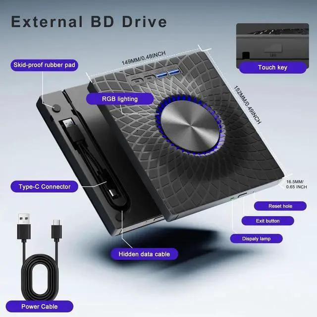 USB3.0 & USB-C (Type-C) & High-Speed Data Transfer Design: Features with both USB3.0 and Type-C connections, achieving up to compatible with Blu-ray8x, 8x DVD, and 24x CD read/write speeds.