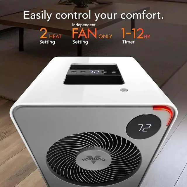 Transform your space with the VMHI500's innovative Vortex Heat Circulation. This compact yet powerful space heater gently warms the entire room, mimicking the efficiency of a full-sized furnace but on a smaller scale. Ideal for any settingbe it your bedroom, office, or under your deskthe sleek design blends seamlessly into your dcor while delivering effective whole-room heating.