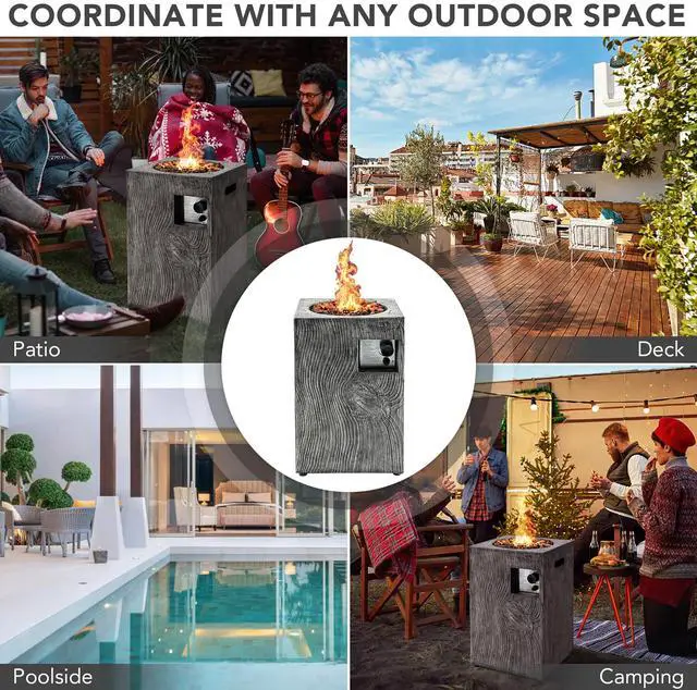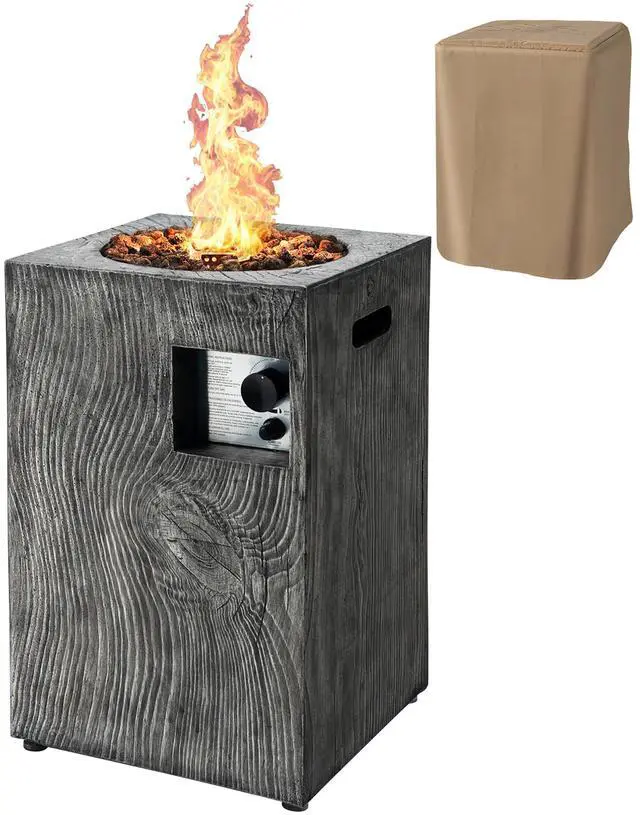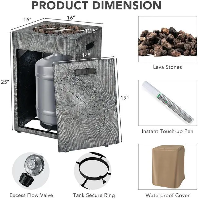 Our 16'' outdoor fire pit with practical design will be an contemporary centerpiece perfect for any patio, deck, or backyard. Made from sturdy steel and weather resistance ore powder material, this gas fire pit can handle harsh weather conditions and high heat with ease. A rain cover is included to increase the fire pits longevity and maintain its appearance for years to come. With control knob for easy flame adjustment and simple on-off controls, you can find the most suitable temperature to enjoy your relaxing time outdoors. The ignitor requires a AAA battery (not included). And the ignition is very simple: step 1: attach to a 20lb propane gas cylinder(not included); step 2: turn the knob and press the ignition button. Our propane fire pit with 30,000 BTU heat output will provide a warm experience for your family and friends whether it is late fall or cold winter. Note: please keep lava rock covered and dry to prevent any crackling during use. Cover the fire pit after it cools down.