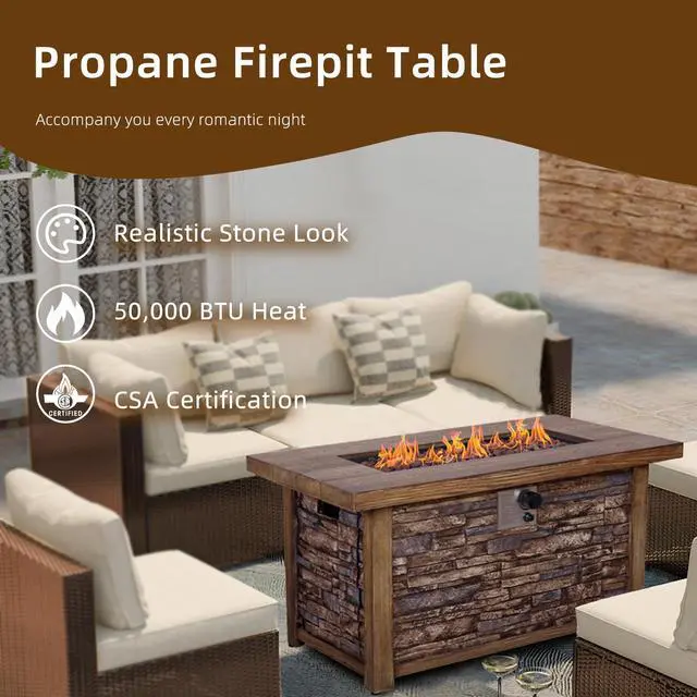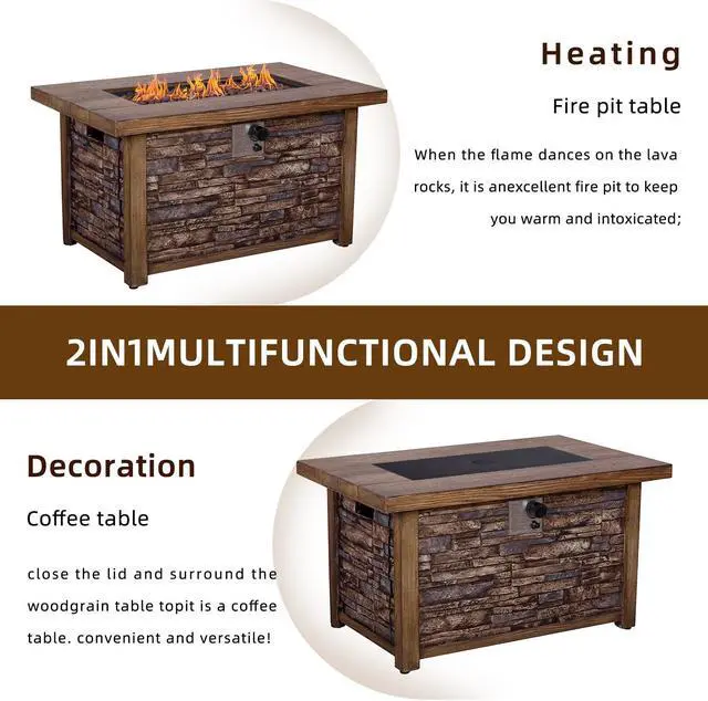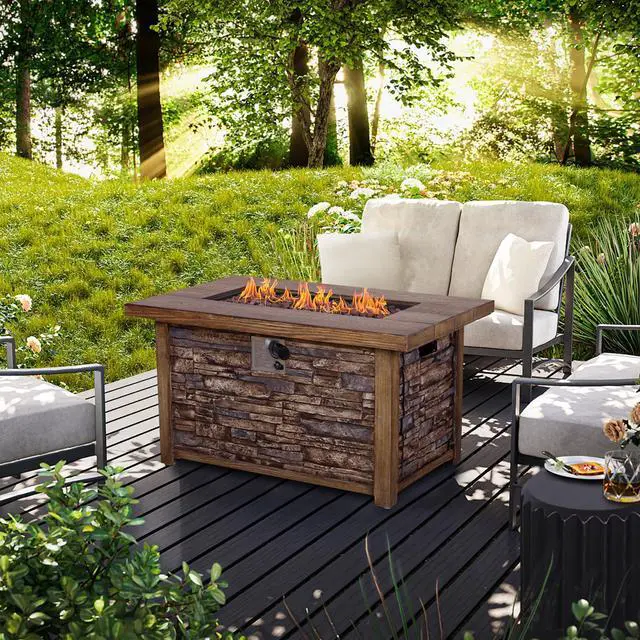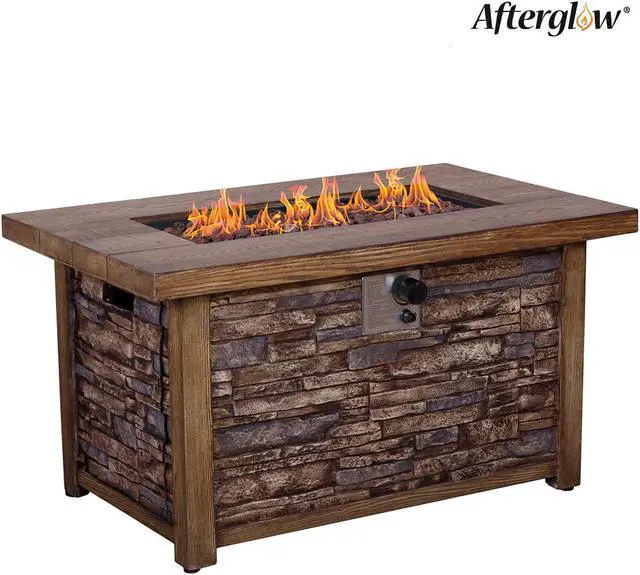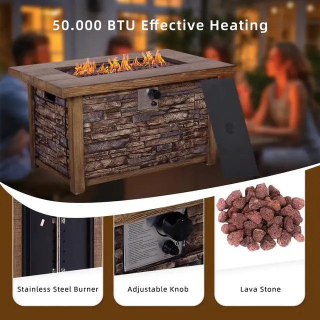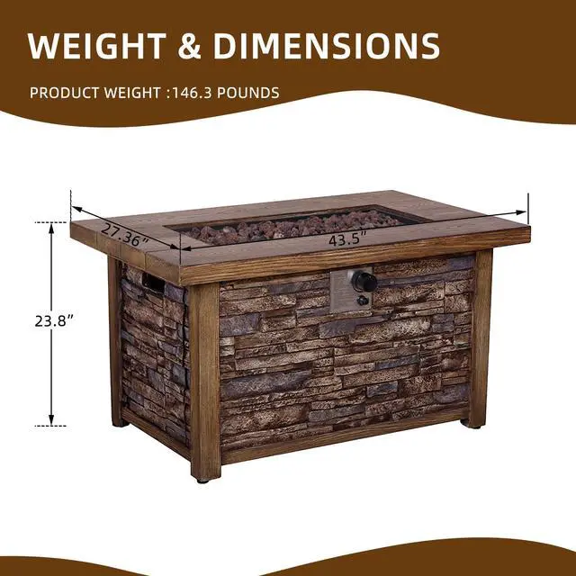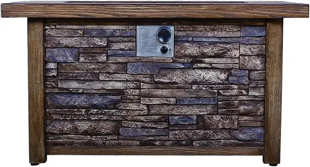 This fire table is mainly made of TerraFab (eco-friendly composite material). The color is rustic brown woodgrain table top with stacked travetine stripe effect. This fire table ensures CAS-approved safety, enhanced quality, and improved performance for your everyday use. Each piece of the fire table is strictly tested before leaving the factory. It is easy to operate with the push-start ignition and adjustable flame option. 50, 000 BTU fire pit is durable.