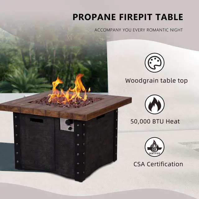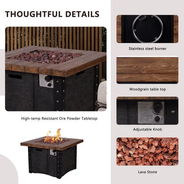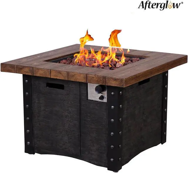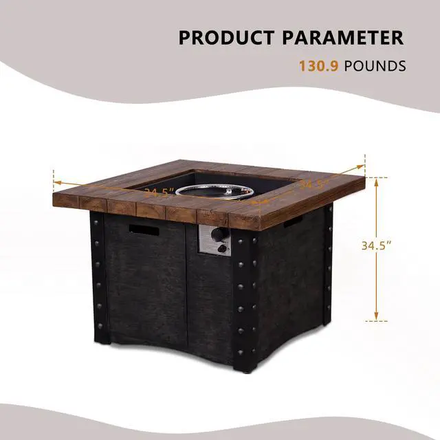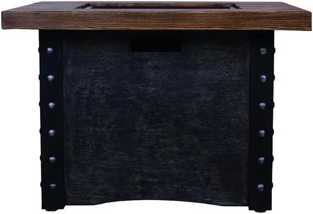 This fire table is mainly made of TerraFab (eco-friendly composite material). The color is antique dark grey woodgrain fire table with cast iron stripe effect. This fire table ensures CAS-approved safety, enhanced quality, and improved performance for your everyday use. Each piece of the fire table is strictly tested before leaving the factory. It is easy to operate with the push-start ignition and adjustable flame option. 50, 000 BTU fire pit is durable.