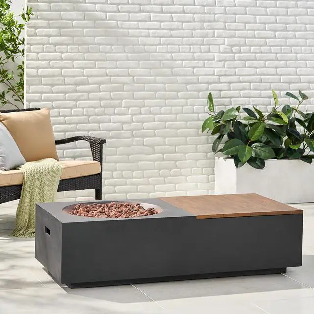 LIGHTWEIGHT CONCRETE: This fire pit is constructed with durable lightweight concrete which can hold a substantial amount of weight. The removable tabletop is finished with a natural wood look.