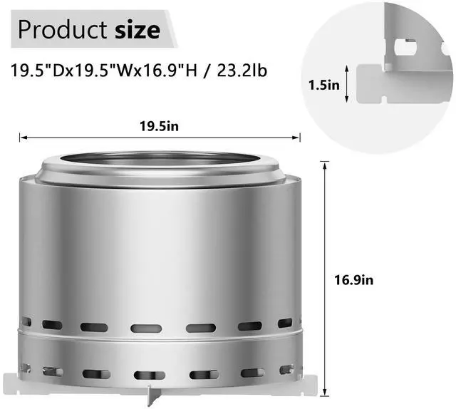 Stainless Steel with Stand: 19.5"L * 19.5"W * 16.9"H. Crafted from high-quality stainless steel, this wood-burning fireplace promise durability and long-lasting performance. The stand provides a stable and secure foundation, enhancing safety while protecting the ground from heat damage.