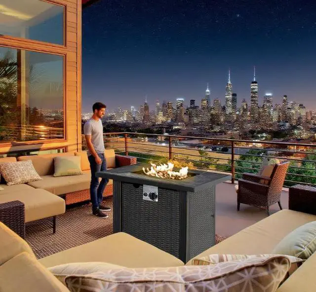 Design: Serves both as a propane fire pit table and an outdoor dining table, with a lid that can cover the top of the pit to create a convenient tiles tabletop. This square fire table features a wicker-based and modern design, simple and elegant.