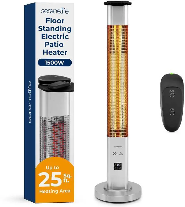 The SereneLife 1500W floor-standing electric patio heater brings the warmth of sunlight to your outdoor space. Equipped with carbon fiber heating elements and an aluminum reflector, it provides efficient and natural heating. With three heat settings and a remote control, you can easily adjust the temperature to your liking. The weather-resistant anodized aluminum housing ensures durability, while safety features like a tip-over switch and overheat protection provide peace of mind. Ideal for patios, garages, or outdoor events, this heater is a reliable companion to keep you warm in any season.