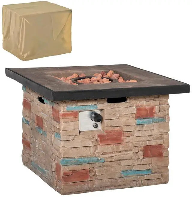Stone Like Look: Our propane fire pit table is made of magnesium oxide, designed with a stacked stone pillar appearance. It can easily add a rustic touch to your outdoor space. The spacious edge of our patio fire pit is excellent for holding drinks, or food.
