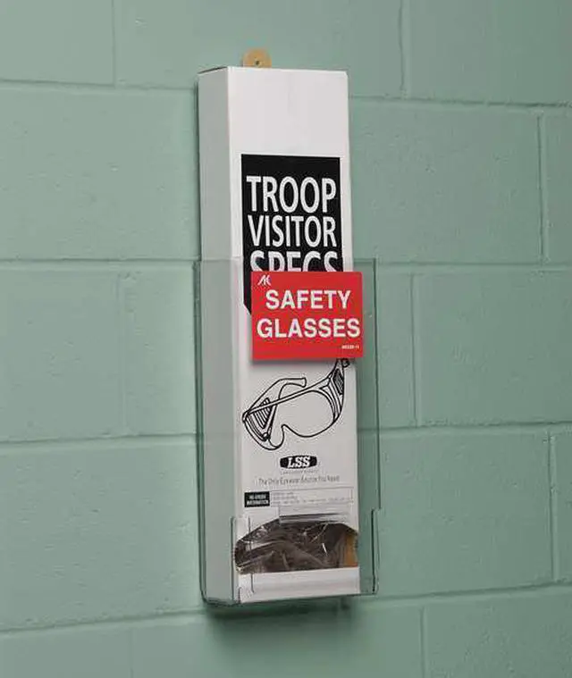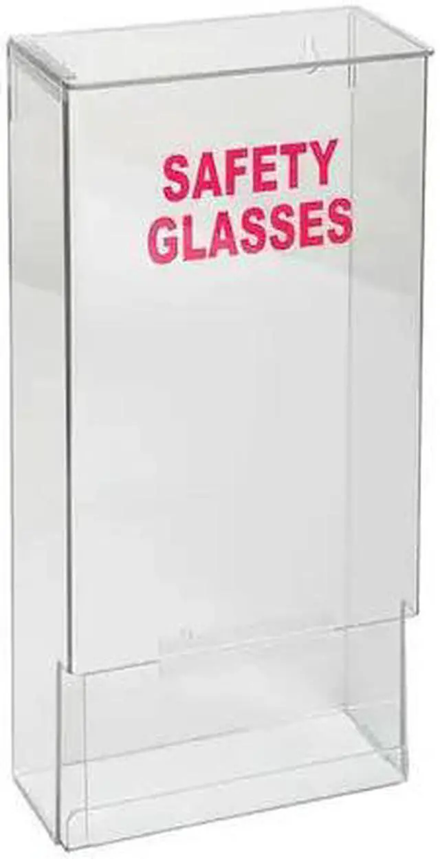 Safety Glasses and Goggles Dispenser, Capacity 20 Pairs, Center-to-Center Mounting Hole Spacing 5 1/2 in, Color Clear, Dispenser Contains Glasses, Goggles, Dispenser Layout 1 Compartment, Dispenser Orientation Vertical, Dispenser Style Stack Tower, Dispensing Method Hinged Lid, Includes Not Applicable, Material PETG, Message Safety Glasses, Mounting Location Wall, Number of Compartments 1, Opening Diameter Not Applicable, Overall Depth 4 in, Overall Height 15 3/4 in, Overall Width 8 in. This item has been restricted from sale in the following state (s): []