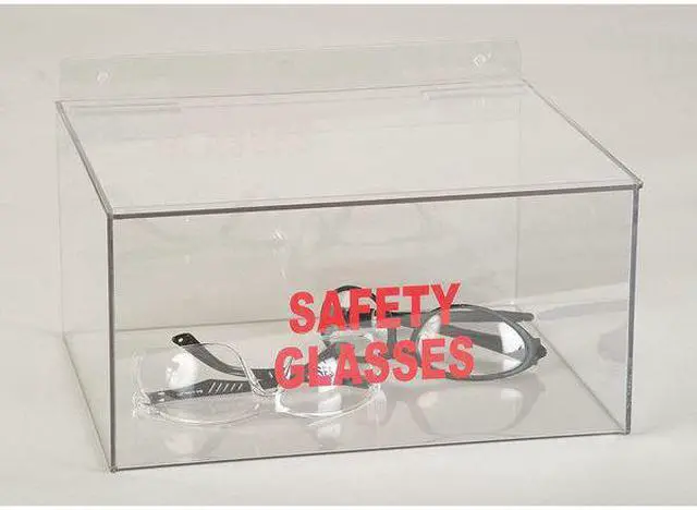 Safety Glasses Dispenser, Capacity 20 Pairs, Center-to-Center Mounting Hole Spacing 9 1/4 in, Color Clear, Dispenser Contains Glasses, Goggles, Dispenser Features Large Capacity, Dispenser Layout 1 Compartment, Dispenser Orientation Horizontal, Dispenser Style Tray, Dispensing Method Hinged Lid, Includes Not Applicable, Material PETG, Message Safety Glasses, Mounting Location Countertop, Wall, Number of Compartments 1, Opening Diameter Not Applicable, Overall Depth 9 1/2 in, Overall Height 7 in. This item has been restricted from sale in the following state (s): []