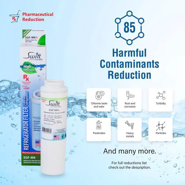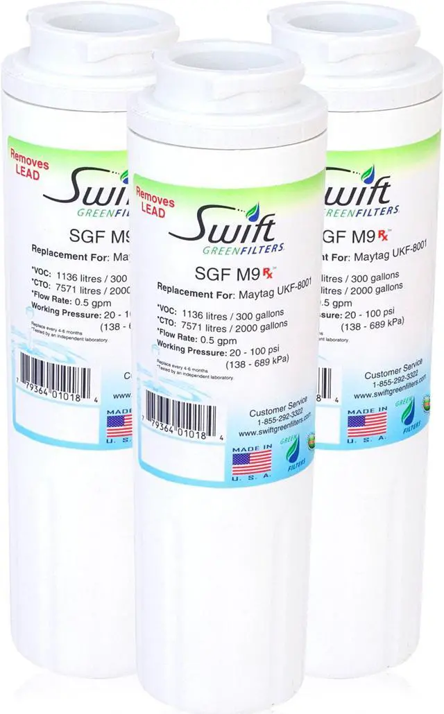 Swift Green Filters SGF-M9 Rx Compatible for UKF8001, EDR4RXD1, FILTER 4, EFF-6007A, 46-9005, 46-9006, CLCH101 Refrigerator water Filter most compatible best in class and technology Internationally Certified .Swift Green Filters will deliver fresh, clean, and great tasting water and ice cubes. Designed with technology using recycled coconut shells that create an internal carbon filter with up to 50% more filtering pores. The result is safe and clean drinking water that has eliminated contaminants and impurities that may have been present.
