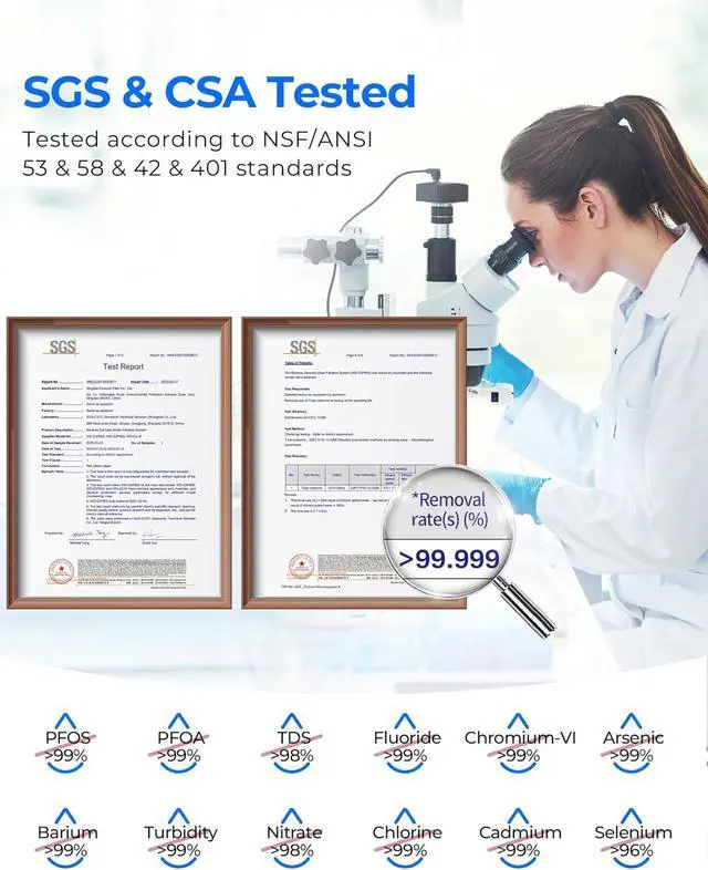 • Tested by official third-party laboratory (SGS), through 10-stage filtration, G3P800 can effectively reduce PFAS, fluoride, heavy metals like lead, chromium, iron, salts like nitrate and chloride as well as large particles and radioactive substances such as radium. Our RO system can reduce such as vinyl chloride, ethylhexyl acrylate, isobutylene, monobutyl ether, according to the reverse osmosis membrane technical manual.