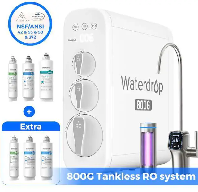 The Waterdrop G3P800 reverse osmosis system offers a higher water capacity (800 gallons per day), thereby meeting demands of a big family for pure water. Furthermore, by high water flow, it filters one cup of water in just 5s. By an advanced water dispensing technology, this tankless RO water filter system produces just a cup of wastewater for every three cups of filtered water produced.