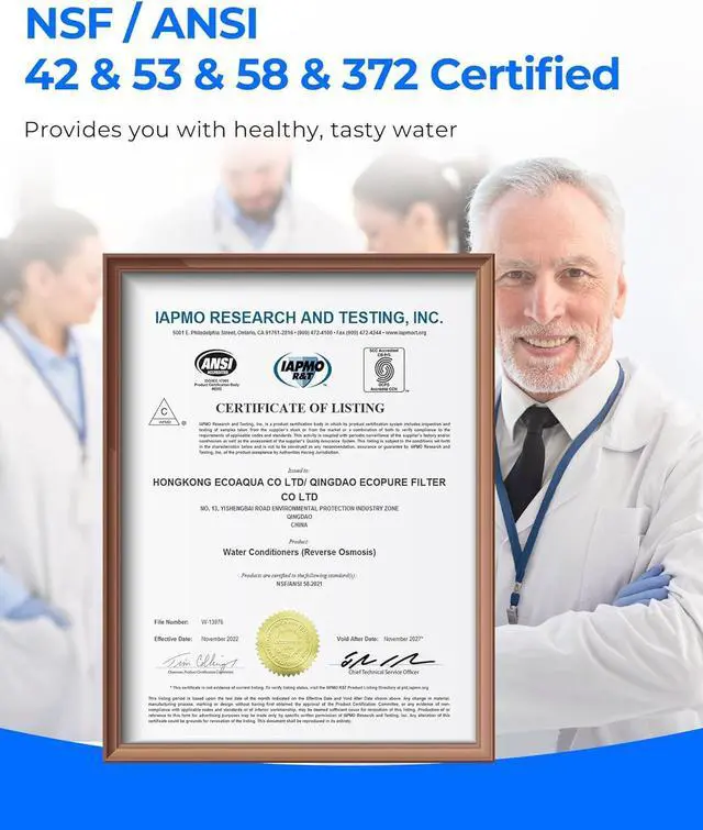 This tankless reverse osmosis system is certified by IAPMO R&T against NSF/ANSI 58 for reduction of TDS. Also it has been tested and certified against NSF 42 to reduce chlorine, bad taste and odor.