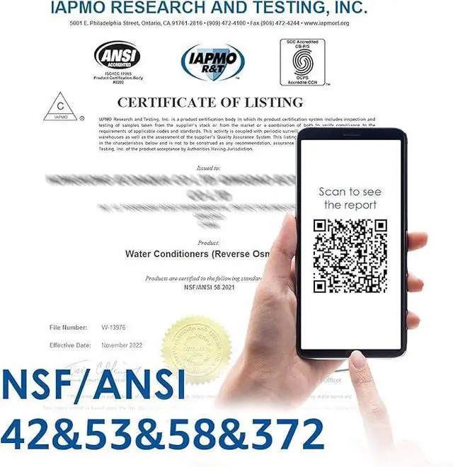 Waterdrop G3P600 reverse osmosis system is certified against NSF/ANSI 58 for TDS reduction and NSF/ANSI 372 certified for lead-free material